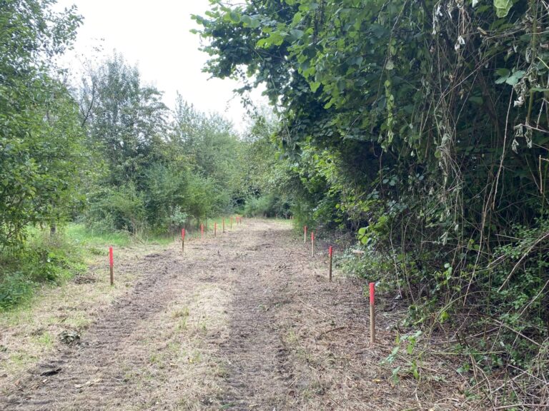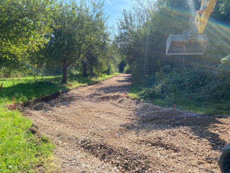 In den ausgehobenen Flächen beginnt nun der Einbau von Tragschichten. Auch in der Streuobstwiese wurden erste Vorbereitungen getroffen. |